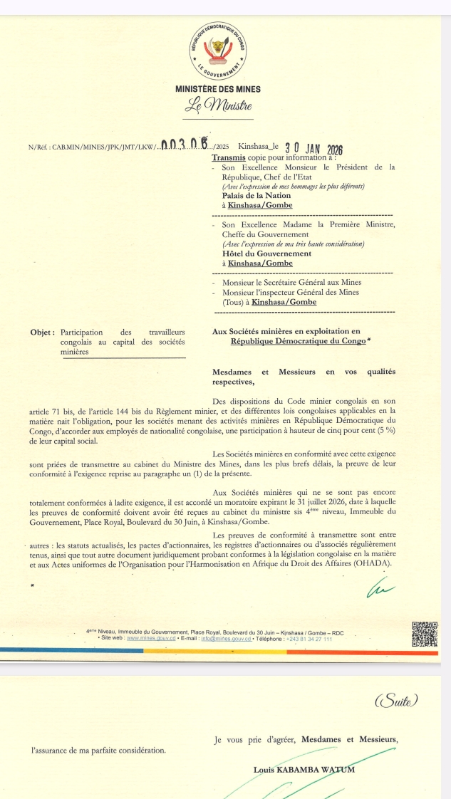 S’appuyant sur l’article 71 bis du Code minier et l’article 144 bis du Règlement minier, le ministre insiste sur une obligation légale claire : toute entreprise minière opérant en RDC doit réserver 5 % de son capital social aux travailleurs congolais. Cette exigence, longtemps négligée par certaines sociétés, n’est ni optionnelle ni décorative. Elle consacre un droit économique fondamental en faveur des nationaux.