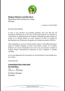 La page se tourne au sein du Comité de Normalisation de la FECOFA, mais elle se referme avec honneur et reconnaissance. À travers une correspondance officielle datée du 19 avril 2026, le président de la Confédération Africaine de Football, Dr.Patrice Motsepe, a tenu à saluer le travail remarquable accompli par la présidente sortante du CONOR/FECOFA, Me Belinda Luntadila Nzuzi.