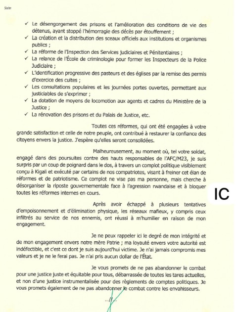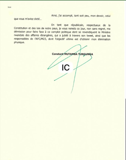 En tant que républicain, respectueux de la Constitution et des lois de notre pays, je vous remets ce jour, non sans regret, ma démission pour faire face à ce complot politique dont se revendiquent le Ministre rwandais des affaires étrangères, qui a jubilé à travers son tweet, ainsi que les responsables de l’AFC/M23, dont l’objectif ultime est d’obtenir mon élimination physique.