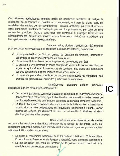 Malheureusement, au moment où, tel votre soldat, engagé dans des poursuites contre des hauts responsables de l’AFC/M23, je suis surpris par un coup de poignard dans le dos, à travers un complot politique visiblement conçu à Kigali et exécuté par certains de nos compatriotes, visant à freiner cet élan de réformes et de patriotisme. Ce complot ne vise pas ma personne, mais cherche à désorganiser la riposte gouvernementale face à l’agression rwandaise et à bloquer toutes les réformes internes en cours.