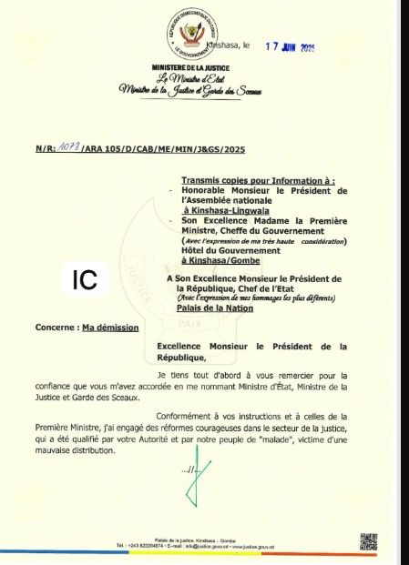 Dans cette lettre de démission, adressée au président Félix Tshisekedi le mardi 17 juin 2025, il vide littéralement son sac. Il y affirme avoir travaillé loyalement au service de la justice congolaise, accuse certaines forces hostiles de complot politique, évoque des tentatives d’empoisonnement, et dénonce une instrumentalisation des institutions.