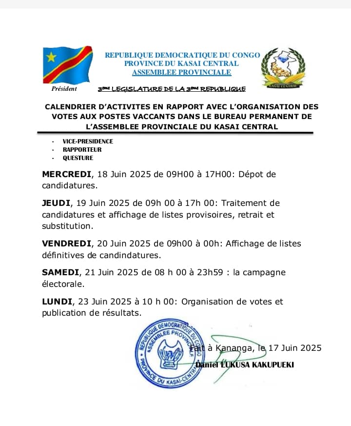 En Rappel, après le trouble du lundi 16 juin 2025, le ministre de l’intérieur Jacquemin Shabani avait, pris un télégramme invitant les membres du bureau d’âge et ceux du bureau déchu, à la surprise générale, Daniel Lukusa publie le calendrier des élections le même jour.