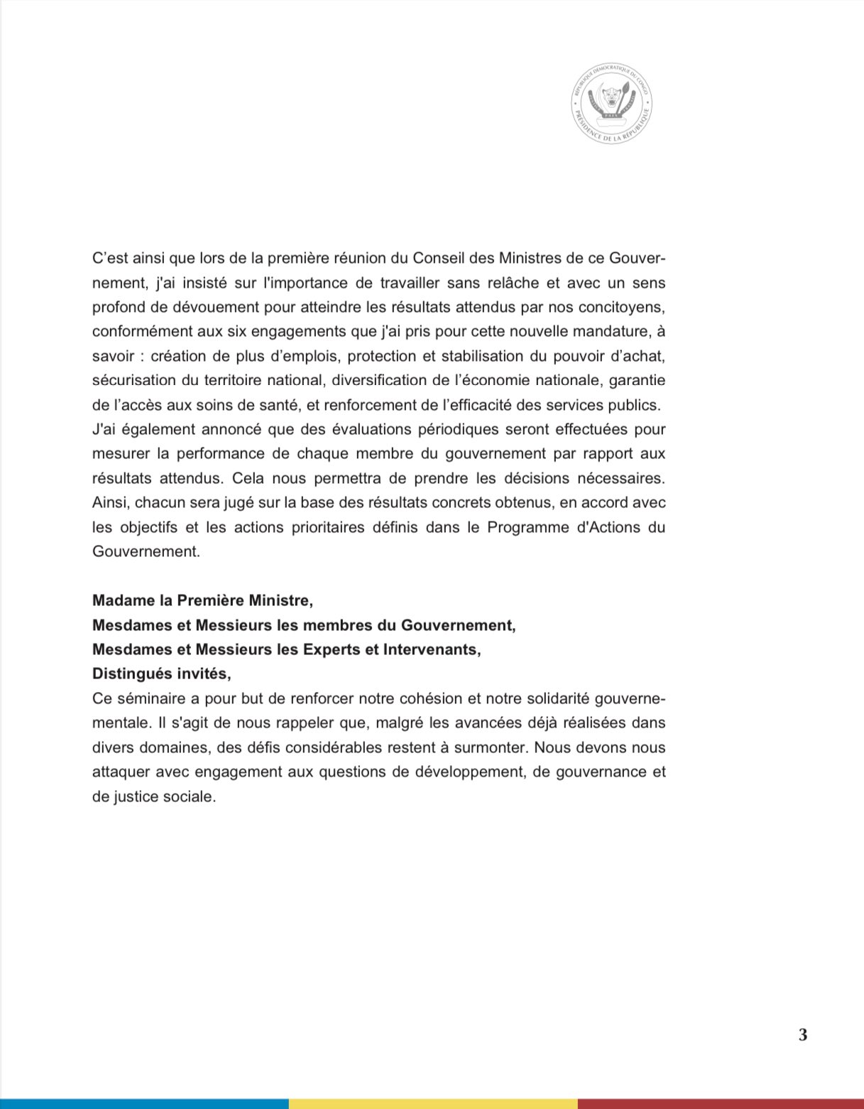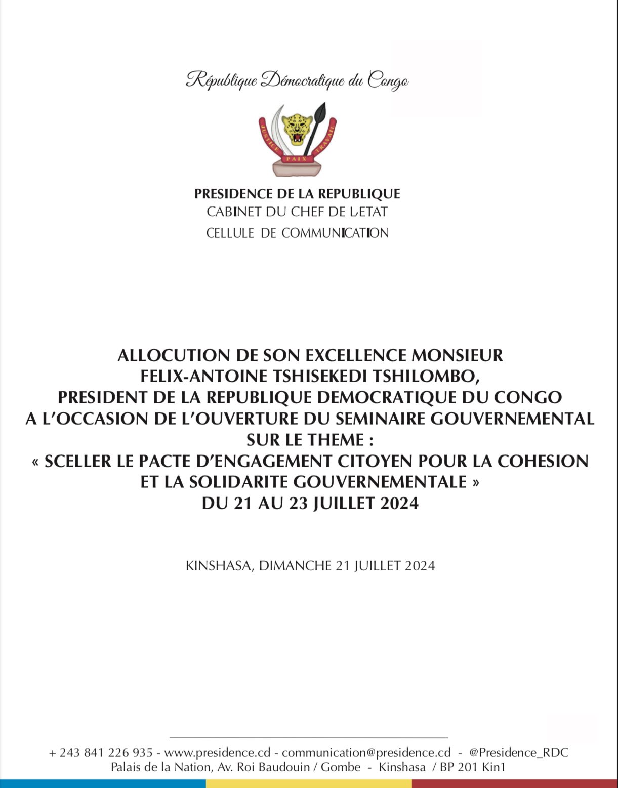 Le Président de la République, Félix-Antoine Tshisekedi a ouvert, le dimanche 21 juillet 2024, les travaux du séminaire gouvernemental au Palais de la Nation à Kinshasa. A l’ouverture de ces assisses, le Chef de l’Etat a appelé les membres du gouvernement Suminwa à travailler dans un esprit de coopération, d’efficacité et de transparence. Il a aussi rappelé que des évaluations seront effectuées et à demander à son assistance de mettre en avant les attentes des concitoyens. Ci-dessous, prenez connaissance de l’intégralité de son discours :
