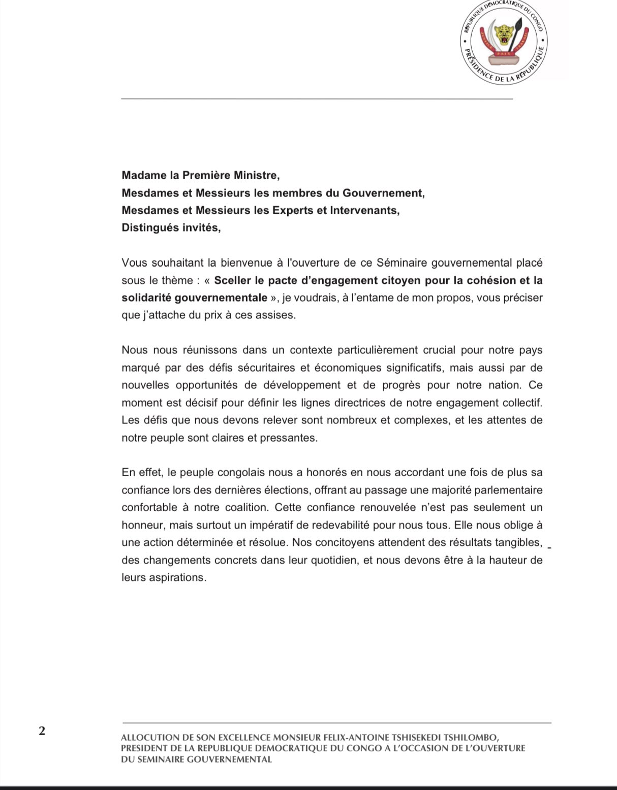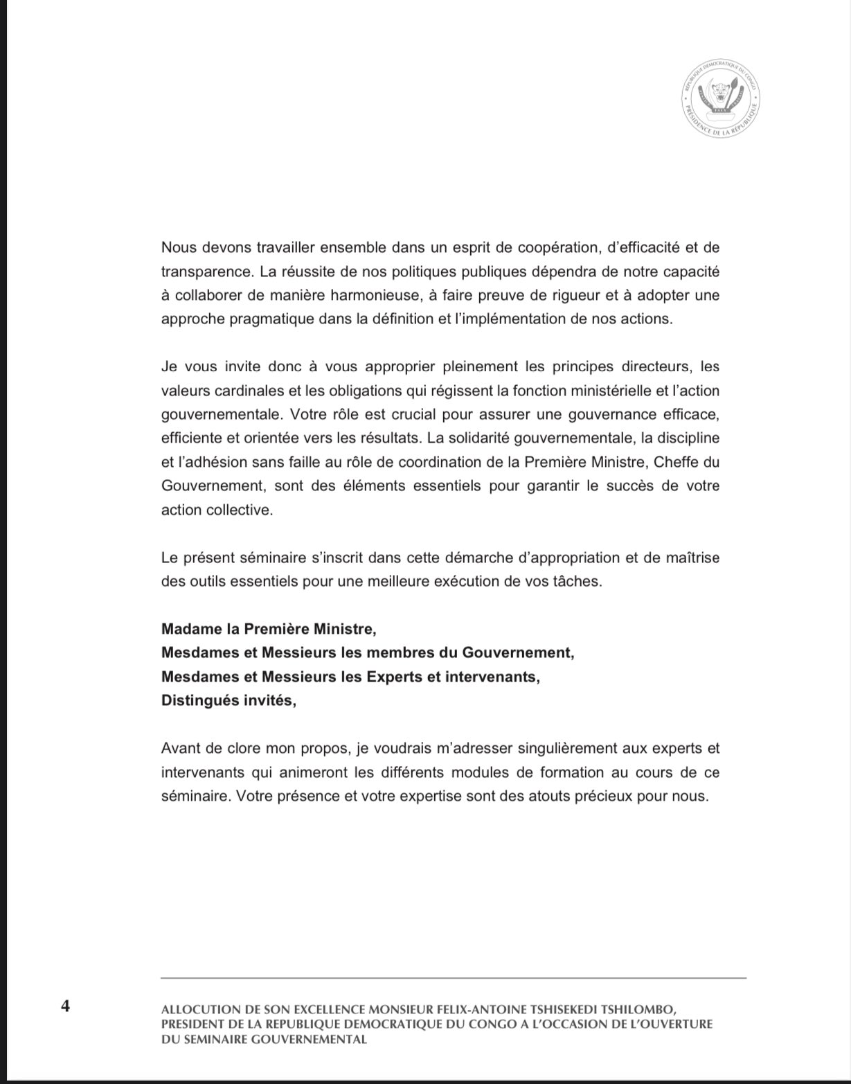 Séminaire du gouvernement : voici le discours complet de Félix Tshisekedi !