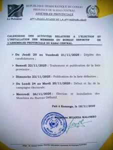 Il convient de rappeler que l’Assemblée provinciale du Kasaï Central a traversé des moments de turbulence, notamment la destitution du précédent bureau et la saisine des juridictions compétentes.