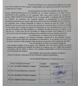 Par ailleurs, les députés signalent également la situation dans le village de Kisanzi, situé entre Magheria et Loutu, où plus de 30 familles seraient contraintes de procéder au morcellement de leurs champs coutumiers. Selon la lettre, ces pratiques entraîneraient des intimidations et accentueraient l’insécurité foncière dans une région déjà fragilisée par les violences armées.